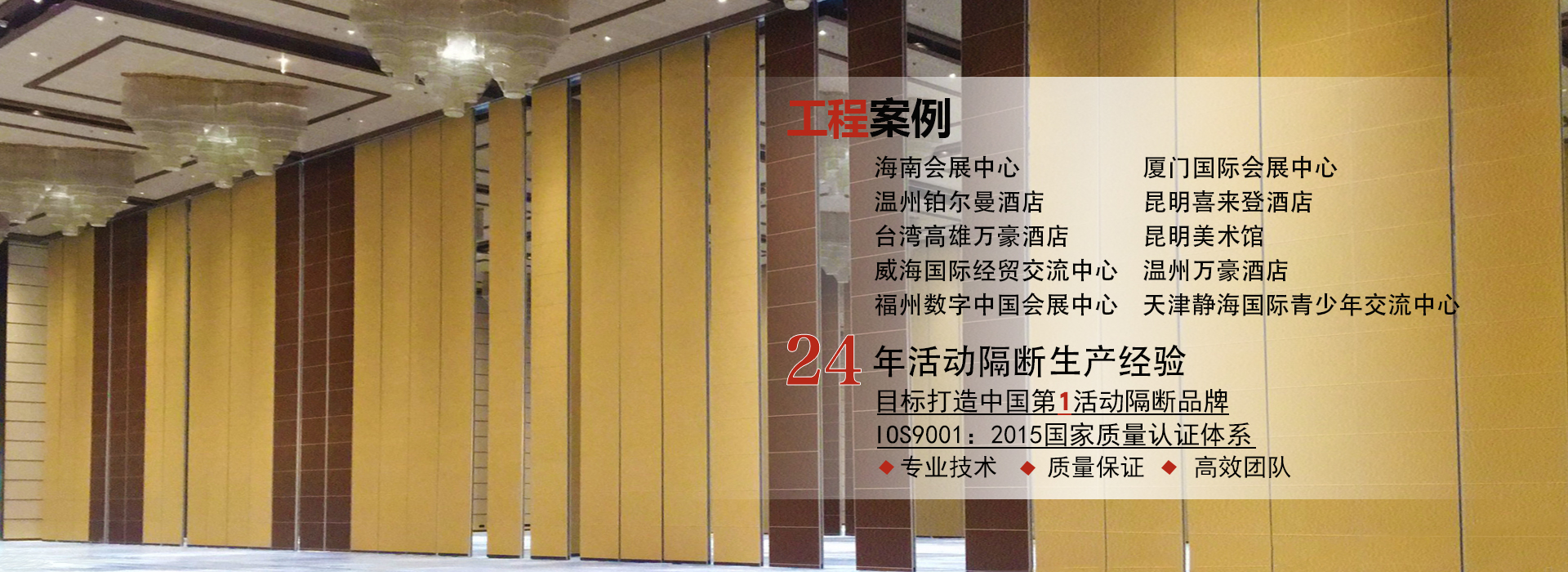 135 3317 7889 何經(jīng)理/189 8866 7889李經(jīng)理廣東一固隔斷制品有限公司成立于1998年,國家高新技術企業(yè),位于中國佛山市南海區(qū)里水鎮(zhèn),是一家專業(yè)從事活動隔斷和辦公室玻璃隔斷系統(tǒng)開發(fā),銷售,生產(chǎn)和售后服務的一站式生產(chǎn)廠商。公司產(chǎn)品廣泛應用于星級飯店,寫字樓,餐廳,宴會廳,會議中心或會展中心等商業(yè)場合,提供便捷有效的空間管理解決方案。最高門板高度可達20米,最大隔音系數(shù)可達56分貝。 一固公司擁有兩個現(xiàn)代化的生產(chǎn)基地,占地超過10,000平方米,...